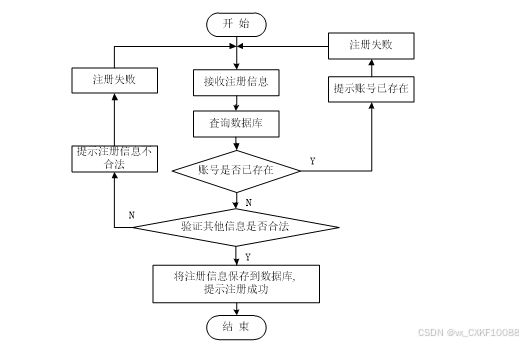 对尚未拥有账号的用户可进行登记以获取账号密码。用户填写登记数据后,当系统接收到这些数据时,它会迅速进行核实。首先,系统会检查数据库中是否有该账户的存在,如果没有,系统会继续核实其他信息,如果有,系统会发出提示,要求用户更改账户,用流程图可以很好的展示出注册的这一过程。