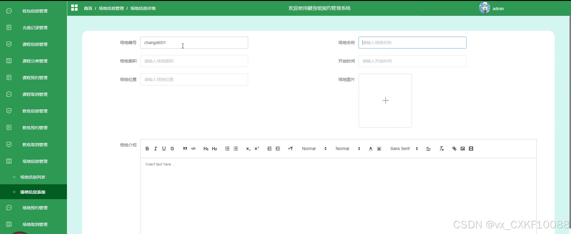 - 场地信息管理:管理员可以更新健身房内的场地信息,如场地位置、开放时间、场地面积等。