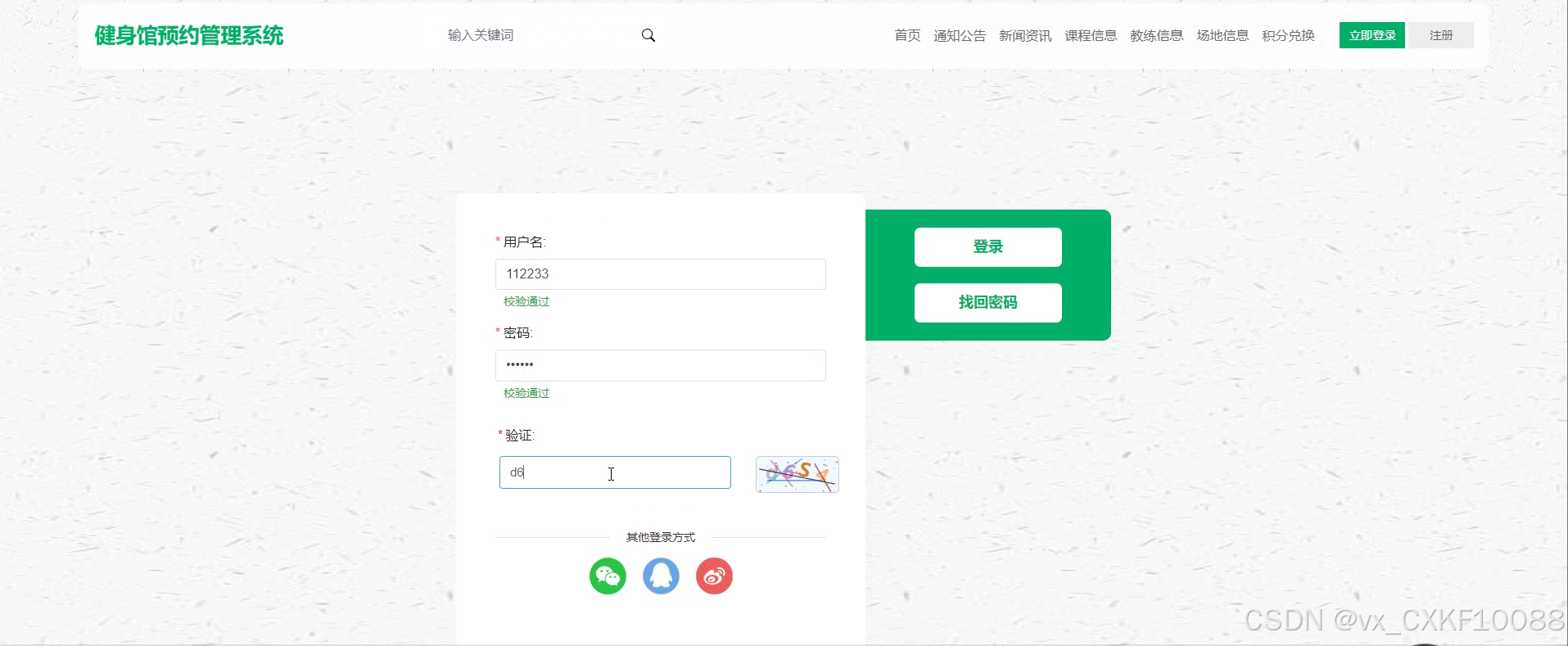 本系统面向健身馆预约管理系统管理员,会员用户,全部用户根据已注册账号及密码登陆,登陆后可选择修改原密码再登陆以增强个人信息安全性。为使用本系统的使用者提供所需的认证。身份被精确验证后,基于所述系统登记用户数据信息,确定所述用户角色是否具有识别权限。
