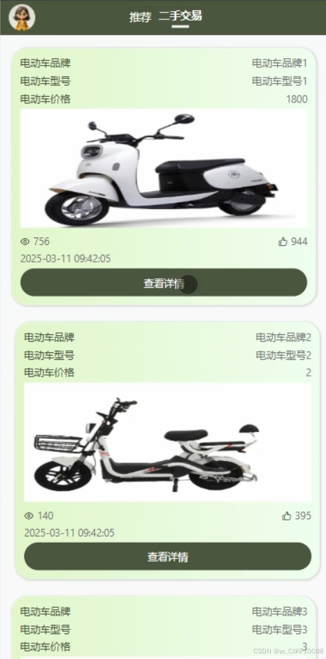 用户进入二手交易页面,浏览电动车交易信息,查看电动车的图片、价格、描述等,联系卖家进行交易。二手交易界面如图5-4所示。