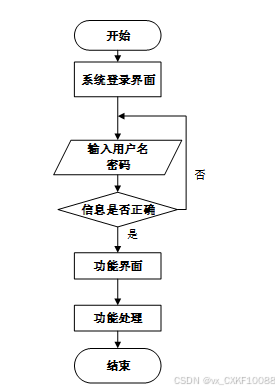 用户首先进入系统登录界面,输入用户名和密码后,系统验证信息是否正确。若验证失败,返回登录界面重新输入;若验证成功,则进入功能界面,执行相应功能处理后结束操作流程。操作流程如图3-5所示。