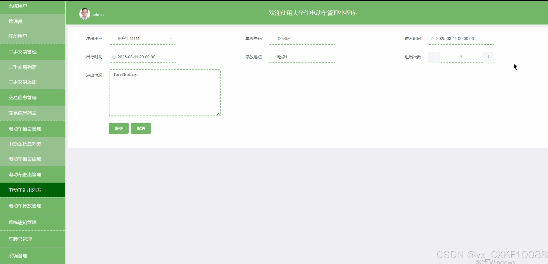 管理员可监控电动车的进出记录,查看电动车是否按规定的时间和地点进出,确保电动车的合理使用。电动车进出管理界面如图5-8所示。