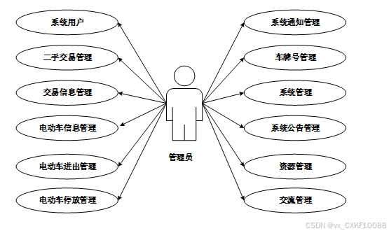 管理员功能包括用户管理、二手交易管理、电动车信息管理、进出管理、停放管理、系统公告发布、资源管理、车牌号管理等。管理员可对系统进行全面管理,确保电动车的有效使用与信息流通,提升校园电动车管理的效率与透明度。