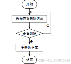 用户选择需要删除的记录后,系统判断是否确认删除。若未确认,返回选择环节;若确认删除,则更新数据库,删除对应记录,完成操作后流程结束。删除信息流程图如图3-8所示。