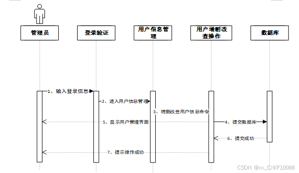 管理员输入登录信息后,进入用户信息管理模块,选择增删改查操作并提交命令至数据库。数据库执行操作后返回成功状态,系统显示用户管理界面并提示操作成功。管理员修改用户信息时序图如图4-5所示。