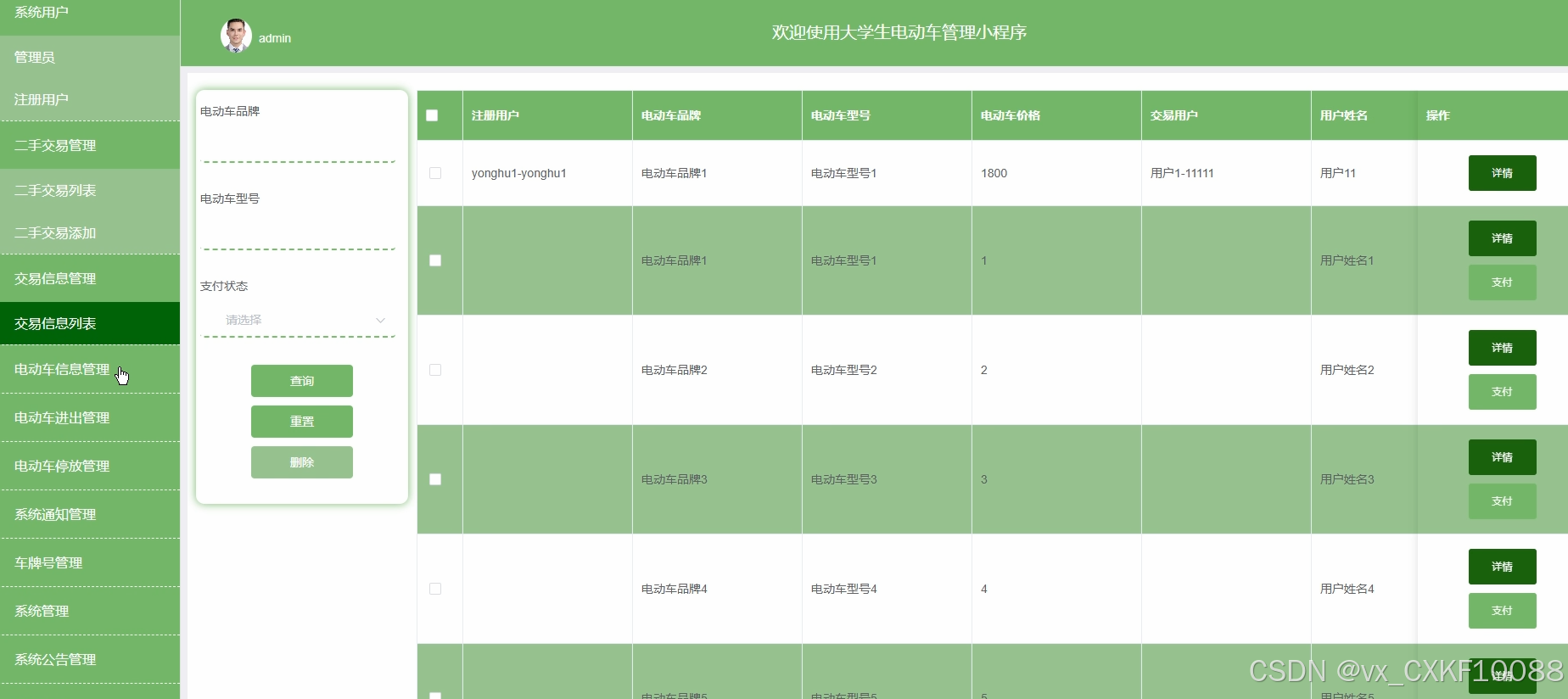 管理员可查看和管理电动车的二手交易信息,包括交易状态、买卖双方信息、交易金额等,确保交易流程的顺利进行。交易信息管理界面如图5-6所示。