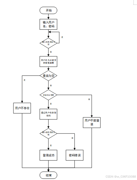 用户输入用户名和密码后,系统先检查输入是否为空,再验证用户名是否存在,若存在则通过用户名获取密码并校验。若密码正确则登录成功,否则提示密码错误。若用户名不存在或无法登录,提示用户操作无效。如图3-4所示。