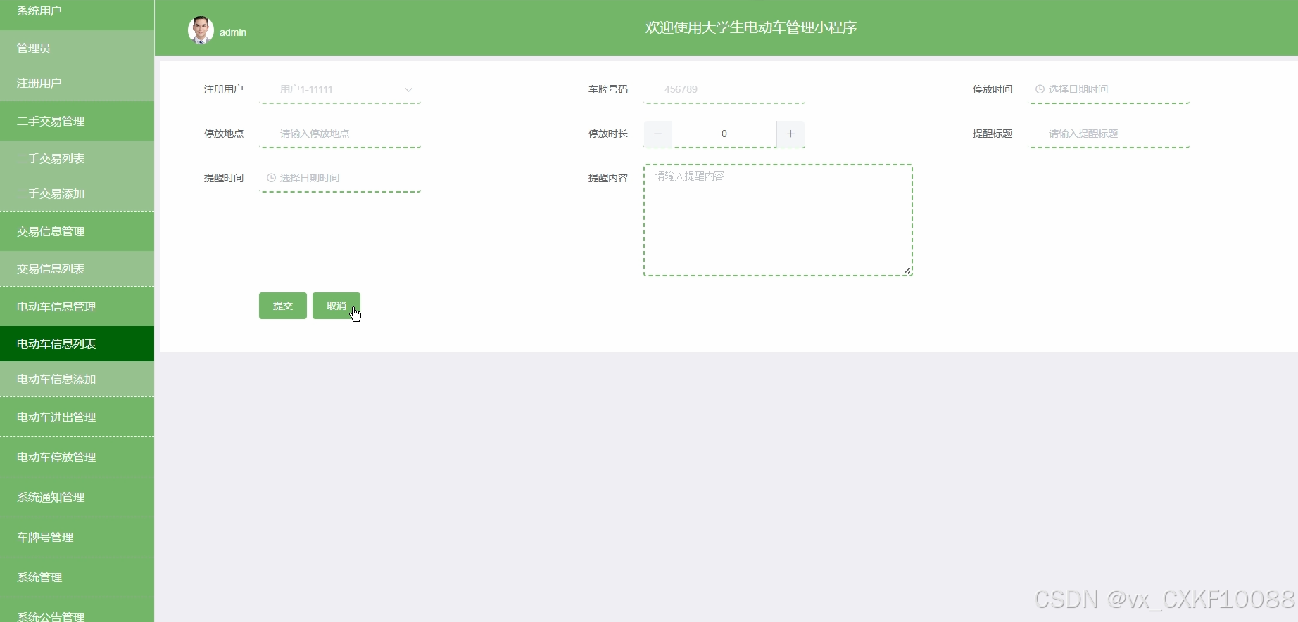 管理员负责电动车停放位置的管理,确保电动车按规定位置停放,避免乱停乱放现象,提高停车效率。电动车停放管理界面如图5-9所示。