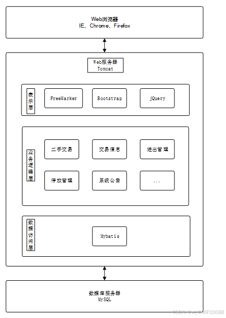 系统由表现层、业务逻辑层、数据访问层和数据库服务器组成。表现层通过浏览器(如IE、Chrome、Firefox)与用户交互,采用FreeMarker、Bootstrap、jQuery等技术实现界面呈现。业务逻辑层负责处理系统的核心业务逻辑,通过分模块设计实现功能分离。数据访问层使用MyBatis框架连接数据库,执行数据的增删改查操作。数据库服务器采用MySQL进行数据存储和管理,为系统提供稳定的数据库支持。整个架构通过Tomcat服务器完成用户请求的接收和处理,确保系统的高效运行[8]。整个系统架构如图4-1所示。