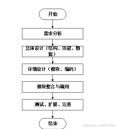 系统开发流程的主要步骤,从需求分析到系统完成的全过程。流程包括需求分析、总体设计(结构、功能、数据)、详细设计(模块、编码)、模块整合与调用,以及测试、扩展和完善,最终完成系统的开发。本系统的开发流程如图3-3所示