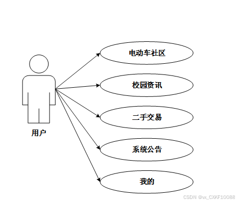 用户功能主要包括查看系统公告、电动车社区互动、校园资讯浏览、二手电动车交易和个人信息管理等。通过这些功能,用户可以便捷地管理电动车,获取校园相关信息,促进电动车资源共享,提升校园内的互动性和信息流通。
