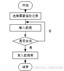 用户首先选择需要修改的记录,输入修改后的数据,系统判断输入数据是否合法。若数据不合法,提示重新输入;若数据合法,则将修改后的数据写入数据库,完成操作后流程结束。修改信息流程图如图3-7所示。