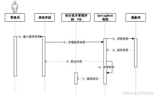 管理员输入登录信息后,登录界面将信息传递至前台管理界面,随后通过SpringBoot框架读取数据库中的用户信息并返回。系统验证信息,若验证成功则登录成功,若验证失败则返回错误提示。登录时序图如图4-4所示。