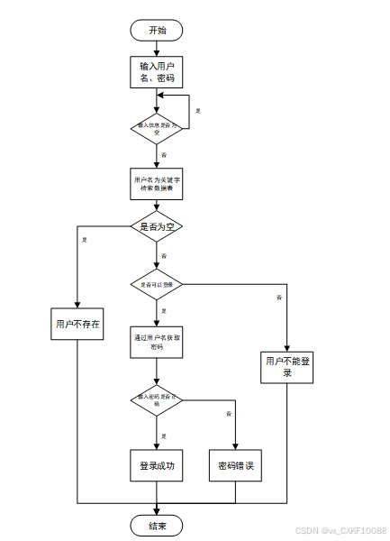 用户输入用户名和密码后,系统先检查输入是否为空,再验证用户名是否存在,若存在则通过用户名获取密码并校验。若密码正确则登录成功,否则提示密码错误。若用户名不存在或无法登录,提示用户操作无效。如图3-4所示。