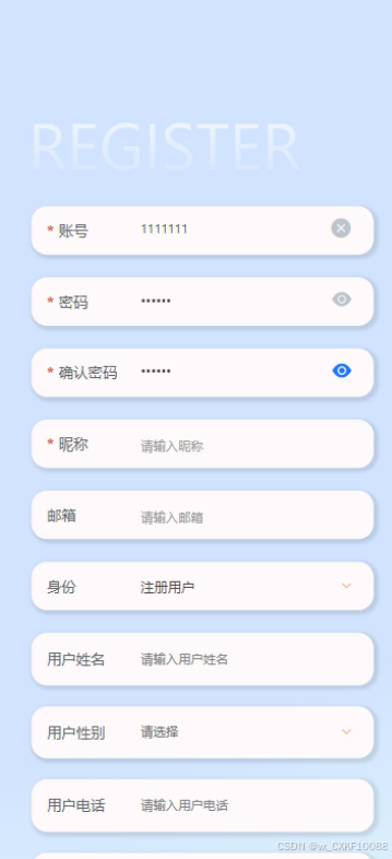 用户注册时,系统要求用户提供必要的信息,例如用户名、密码、电子邮件地址等。这些信息通常由用户在注册表单中输入,并通过前端验证确保格式的正确性。注册过程完成后,系统会为新用户创建一个账户。这包括分配一个唯一的用户ID和设置初始的权限或者角色。用户注册界面如图5-1所示。
