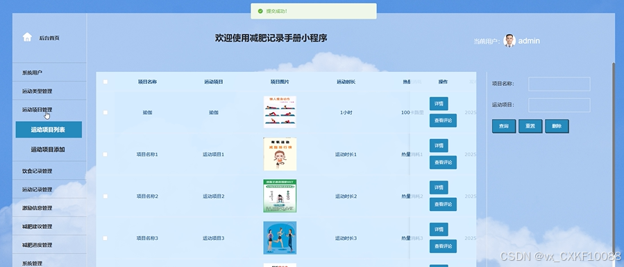 管理员可管理具体的运动项目,包括项目的名称、描述、图片、热量消耗等信息,确保项目信息的准确性和完整性。运动项目管理界面如图5-8所示。