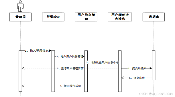 管理员输入登录信息后,进入用户信息管理模块,选择增删改查操作并提交命令至数据库。数据库执行操作后返回成功状态,系统显示用户管理界面并提示操作成功。管理员修改用户信息时序图如图4-5所示。