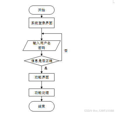 用户首先进入系统登录界面,输入用户名和密码后,系统验证信息是否正确。若验证失败,返回登录界面重新输入;若验证成功,则进入功能界面,执行相应功能处理后结束操作流程。操作流程如图3-5所示。