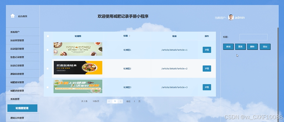 管理员可以管理轮播图的上传、编辑或删除首页轮播图,提升系统美观度。系统管理界面如图5-10所示。