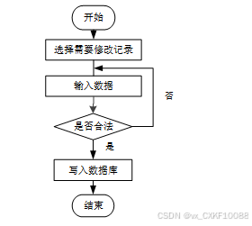 用户首先选择需要修改的记录,输入修改后的数据,系统判断输入数据是否合法。若数据不合法,提示重新输入;若数据合法,则将修改后的数据写入数据库,完成操作后流程结束。修改信息流程图如图3-7所示。