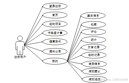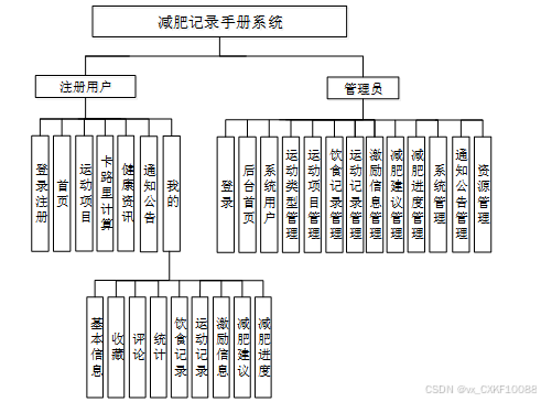 系统功能模块设计是系统开发过程中的重要阶段,它旨在将系统划分为不同的模块,每个模块负责完成特定的功能或任务。基于node和vue的减肥记录手册系统由前台和后台两大功能模块组成,每个模块下又包含具体的功能操作。系统功能模块图如下所示。