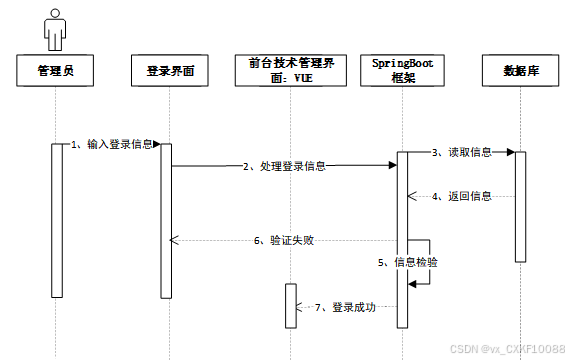 管理员输入登录信息后,登录界面将信息传递至前台管理界面,随后通过Koa框架读取数据库中的用户信息并返回。系统验证信息,若验证成功则登录成功,若验证失败则返回错误提示。登录时序图如图4-4所示。