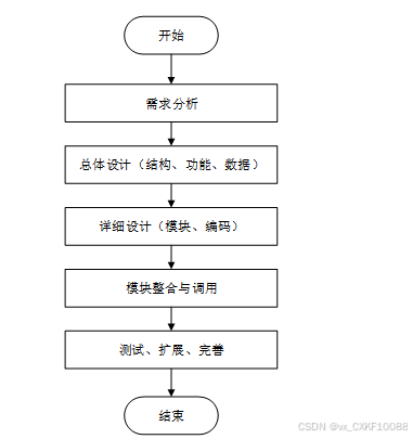 系统开发流程的主要步骤,从需求分析到系统完成的全过程。流程包括需求分析、总体设计(结构、功能、数据)、详细设计(模块、编码)、模块整合与调用,以及测试、扩展和完善,最终完成系统的开发。本系统的开发流程如图3-3所示