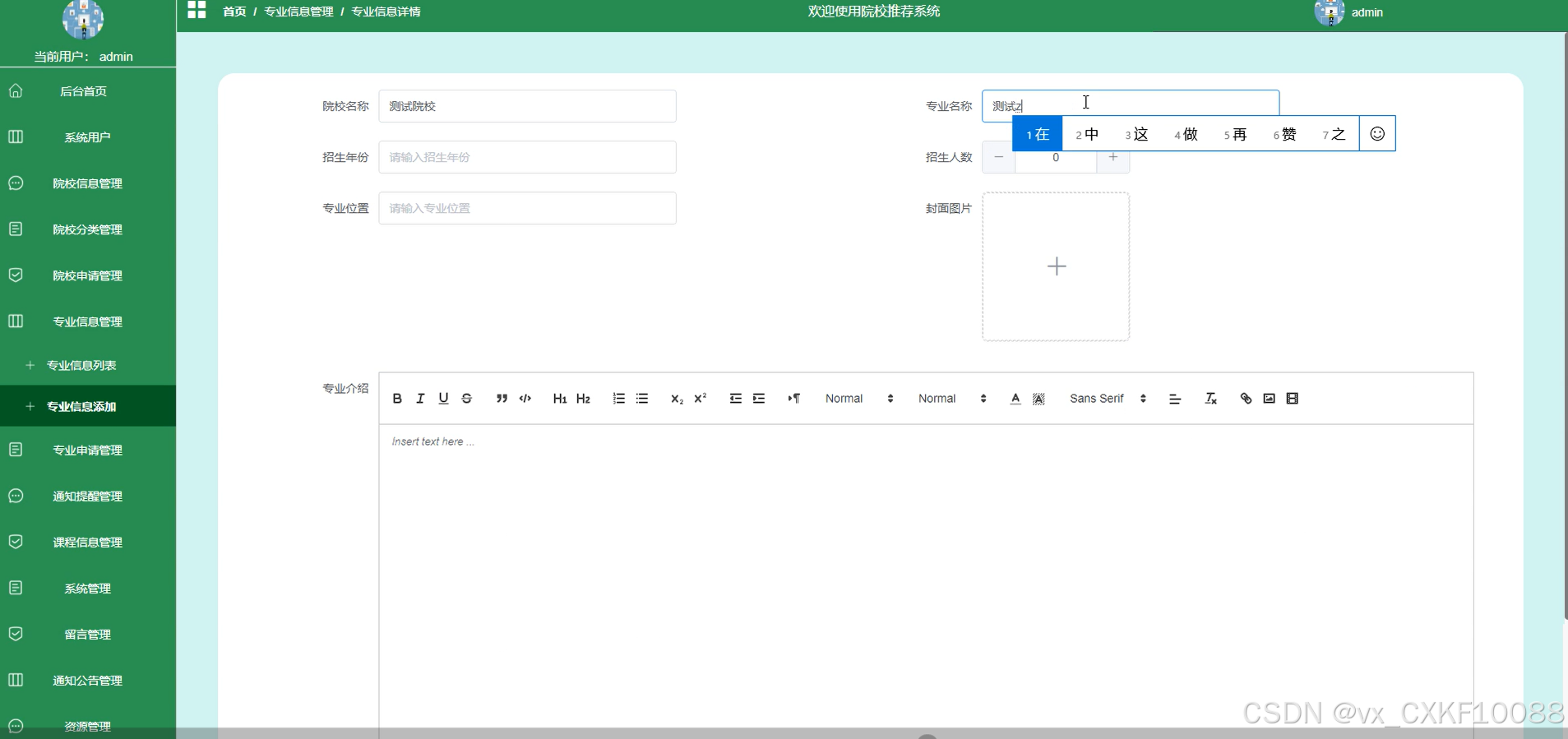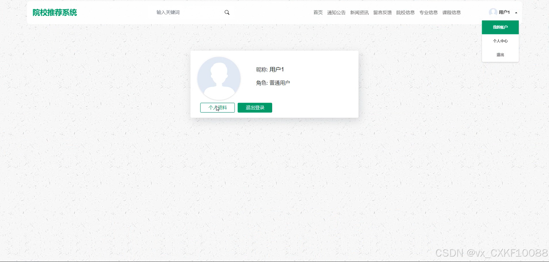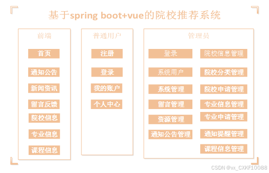基于spring boot+vue的院校推荐系统设计与实现包含前端跟后端,其中还后端包含普通用户、管理员两个角色划分,主要功能如下: