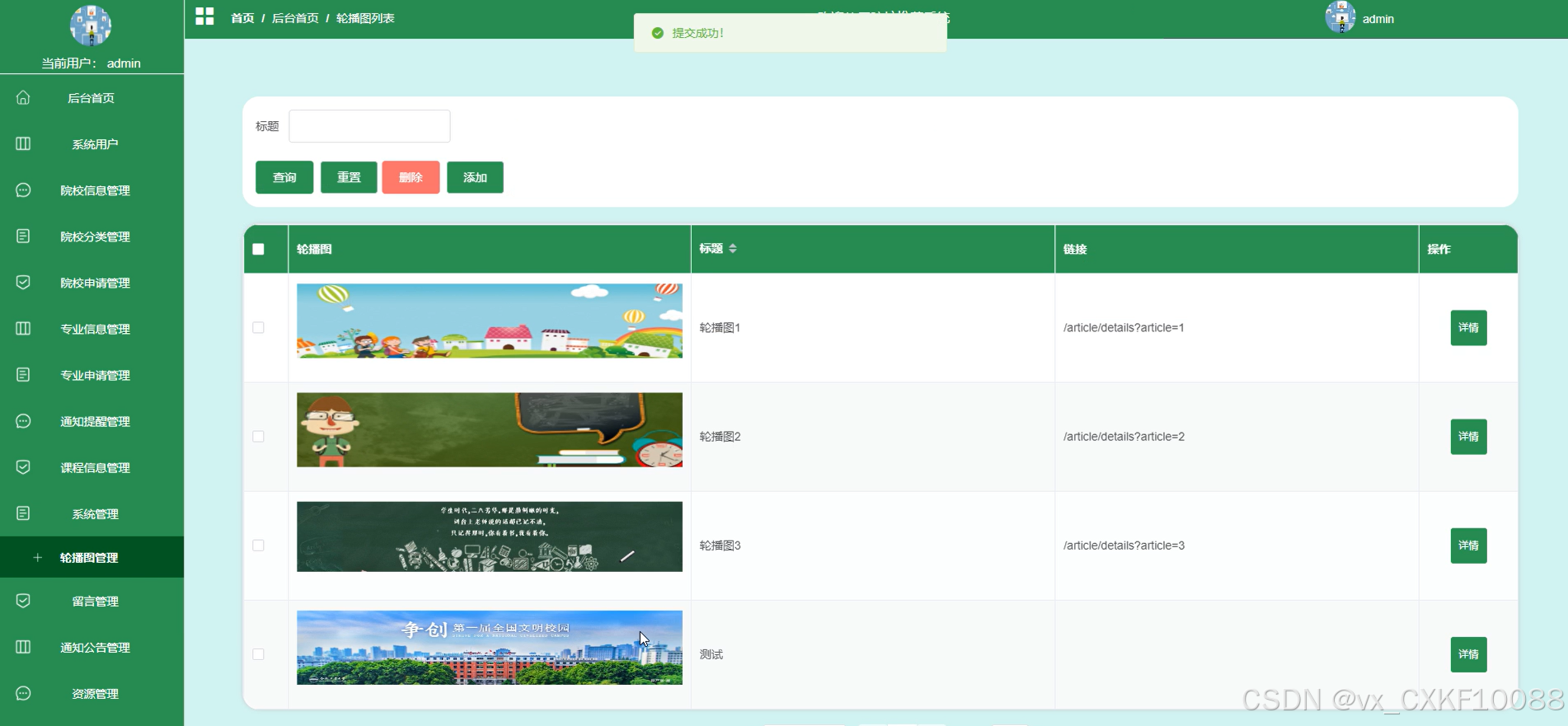 (9)系统管理:轮播图管理:可以查看轮播图详情,以及查询、重置、删除、添加等操作。