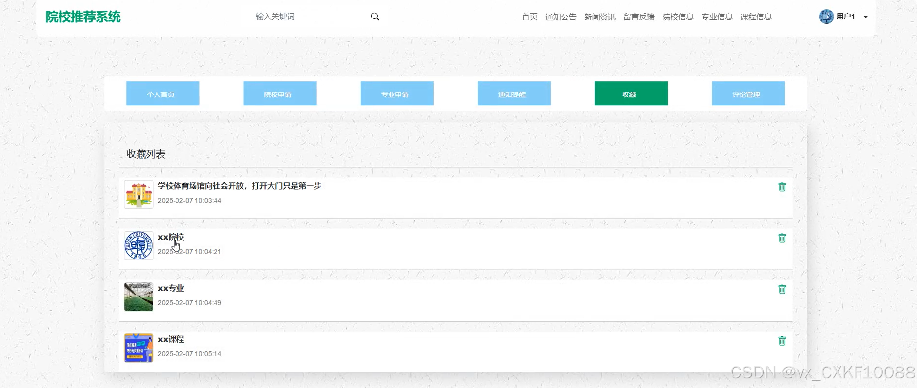 (4)个人中心:包含个人首页、院校申请、专业申请、通知提醒、收藏、评论管理等。院校申请:提交对特定院校的入学申请。专业申请:针对心仪的专业进行申请操作。通知提醒:接收来自系统的各种通知,如申请状态更新等。收藏:保存感兴趣的院校、专业或课程,方便日后查阅。评论管理:查看和编辑自己发布的评论。