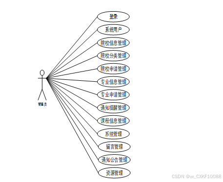 管理员具备后台首页、系统用户、院校信息管理、院校分类管理、院校申请管理、专业信息管理、专业申请管理、通知提醒管理、课程信息管理、系统管理、留言管理、通知公告管理、资源管理等需求用例。详细用例图如图3-2所示。