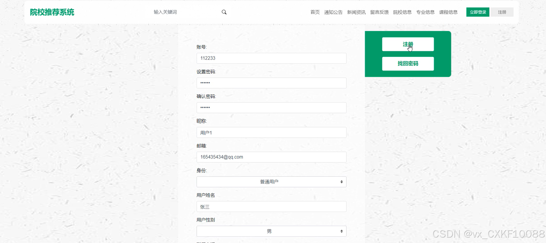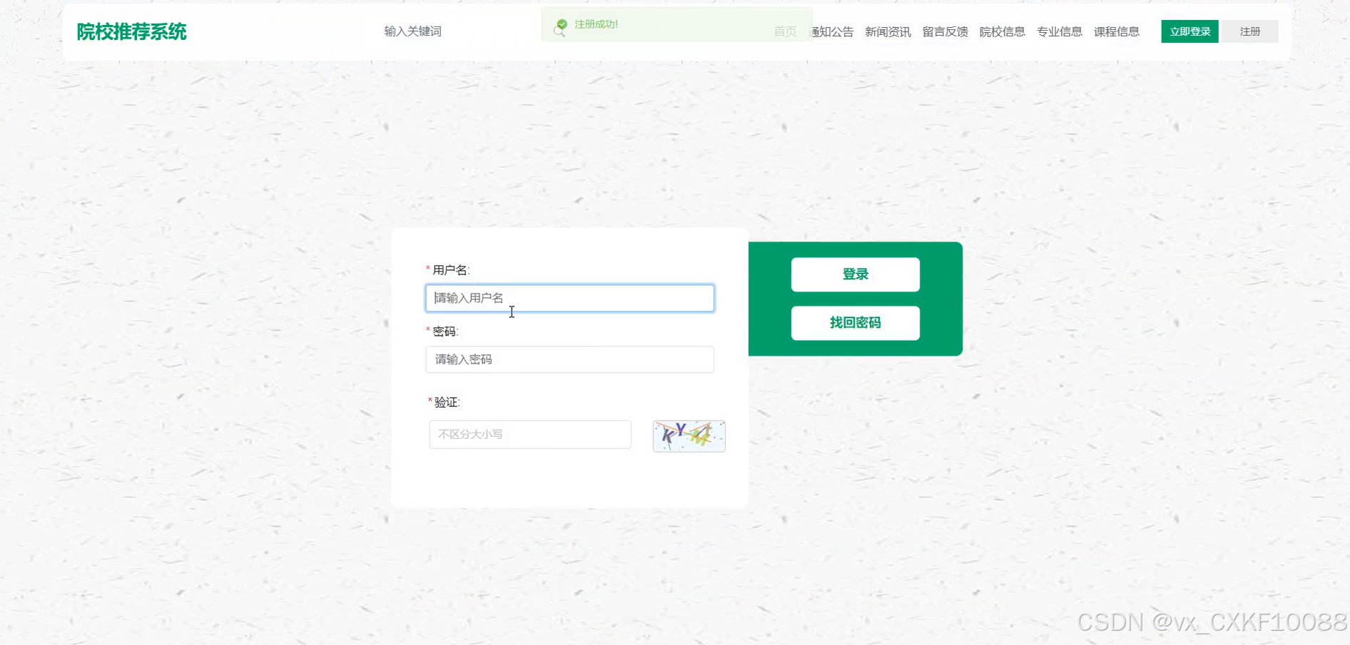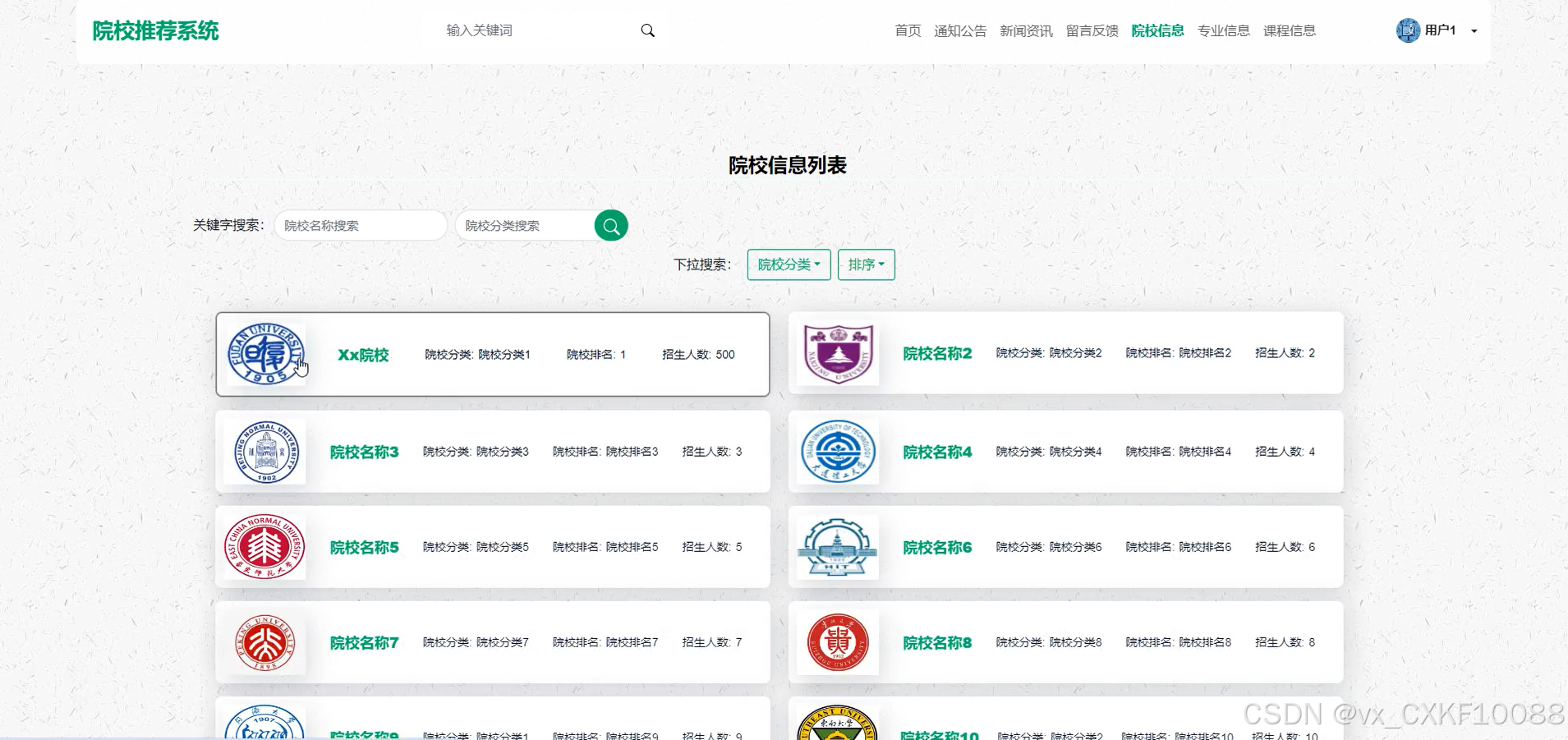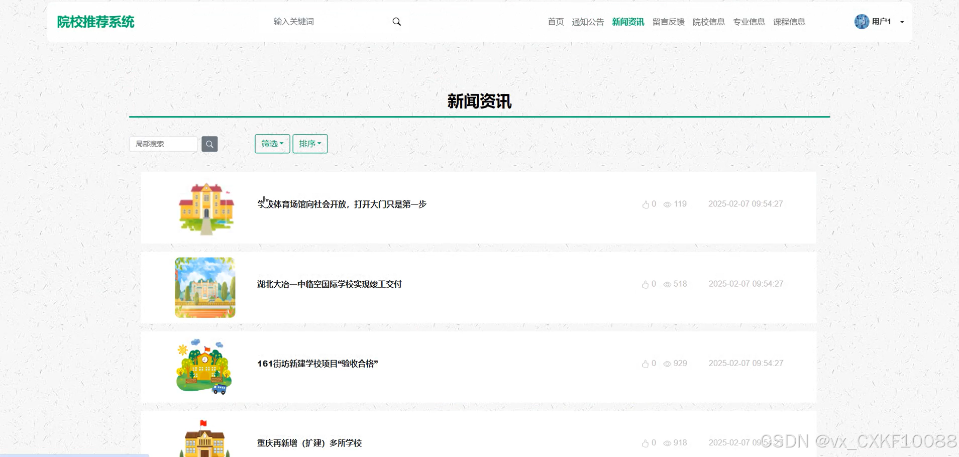 With the rapid development of information technology, the Internet has become one of the main ways for people to obtain information. In the field of education, students and parents are increasingly dependent on the information resources on the Internet to choose the right school. However, in the face of the massive amount of information, how to efficiently and accurately screen out the university information that meets the needs of individuals has become a challenge. The traditional search method often requires users to manually input keywords to search, and compare the characteristics of different universities by reading a lot of content of text. This method is not only time-consuming, but also difficult to comprehensively consider the complex relationship between various factors. The university recommendation system based on Spring Boot + Vue aims to provide users with an intelligent and personalized university selection platform by using modern software development technology and algorithm models. Spring Boot As a popular Java framework, it simplifies the initial construction and development process of Spring-based applications, and can quickly build independent production-level Spring applications. Vue.js Is a progressive framework for building a user interface, ideal for building single-page applications (SPA), and its flexibility and ease of use make it ideal for front-end development