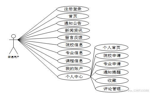 基于spring boot+vue的院校推荐系统用例分析主要从普通用户,管理员这些实体展开描述。