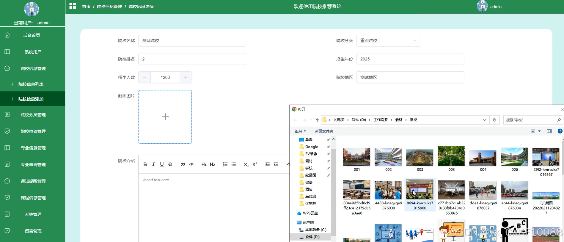 院校信息管理:院校信息列表与院校信息添加。院校信息列表可查看院校信息数据,并可查看每个院校详情与评论信息,并可进行查询、重置、删除和添加操作。院校信息列表如图5-11所示。院校信息添加如图5-12所示。