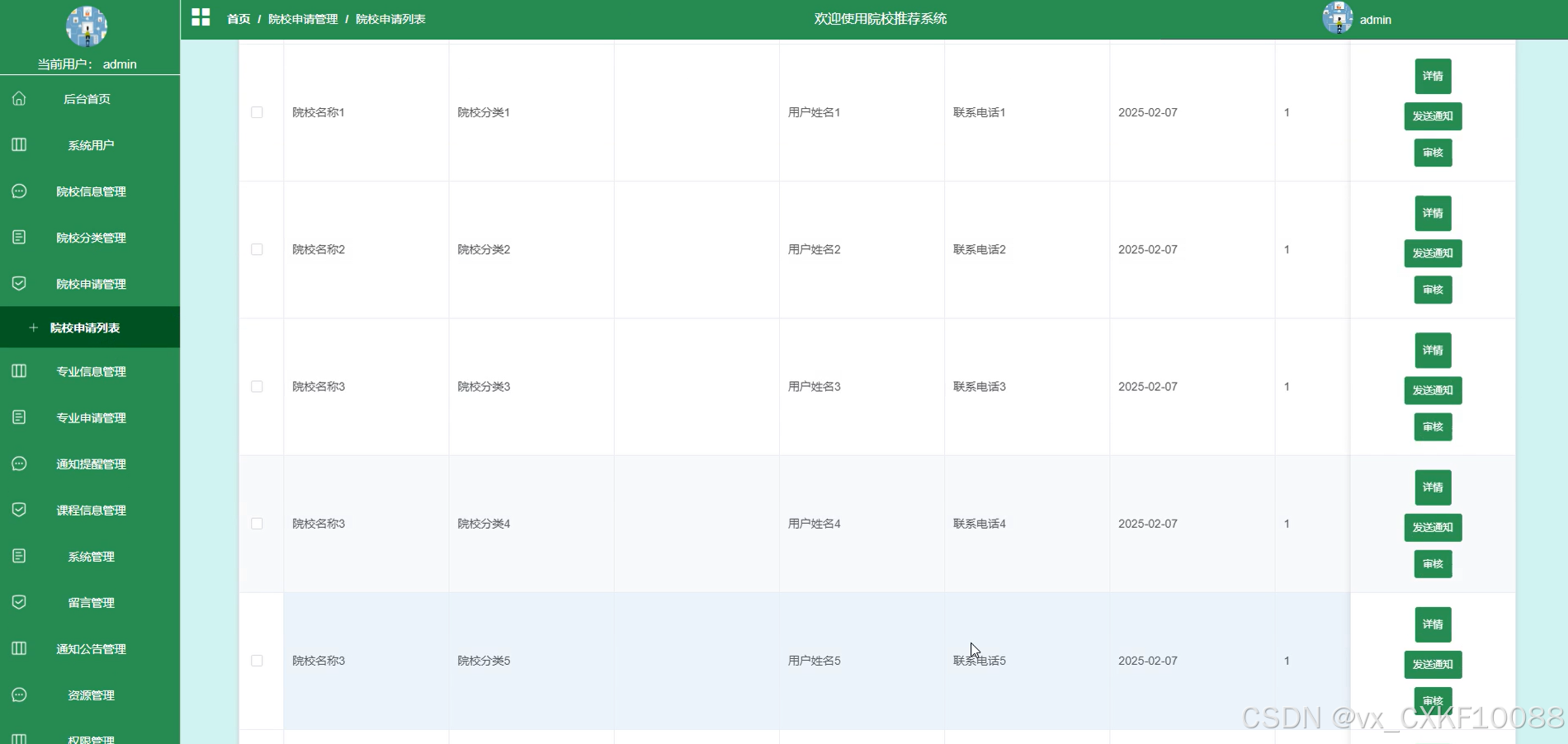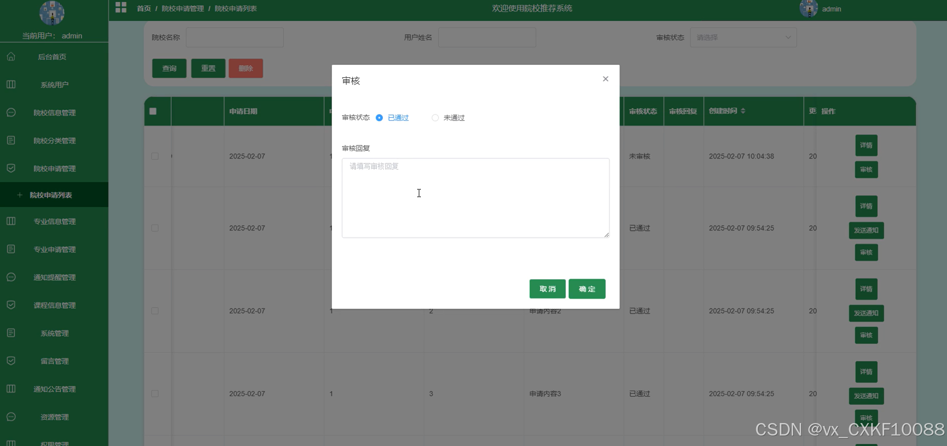 院校申请管理:主要展示院校申请列表可查看详情,处理院校申请状态。院校申请列表如图5-13所示。院校申请信息处理如图5-14所示。