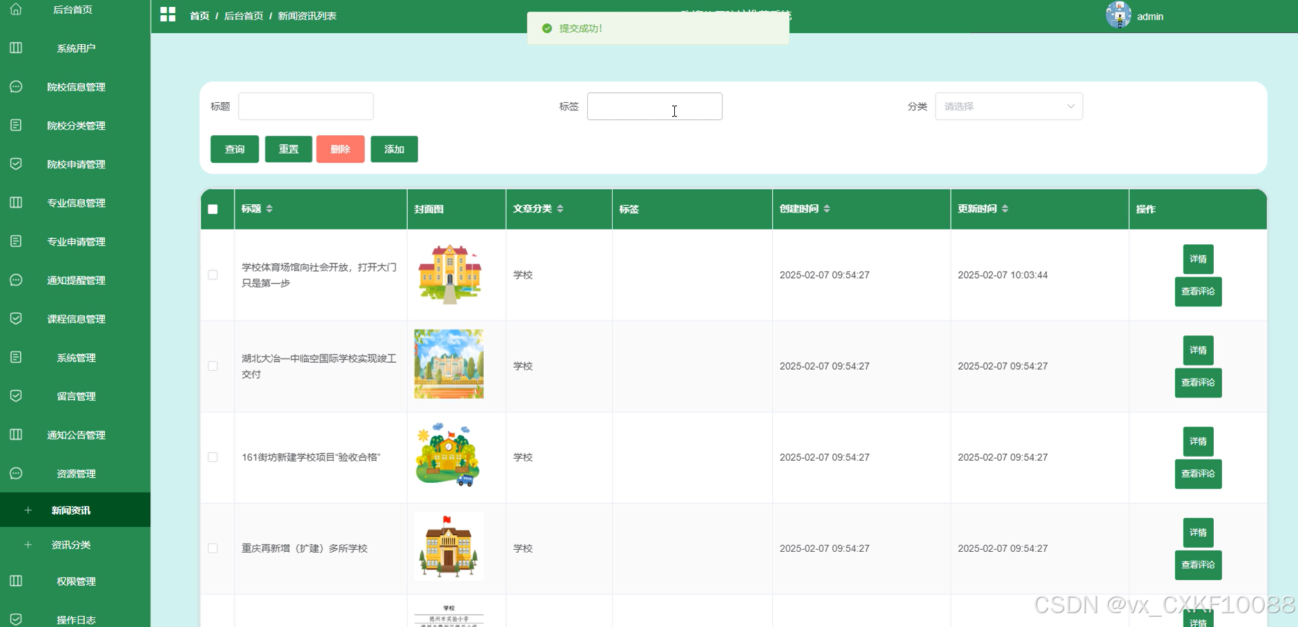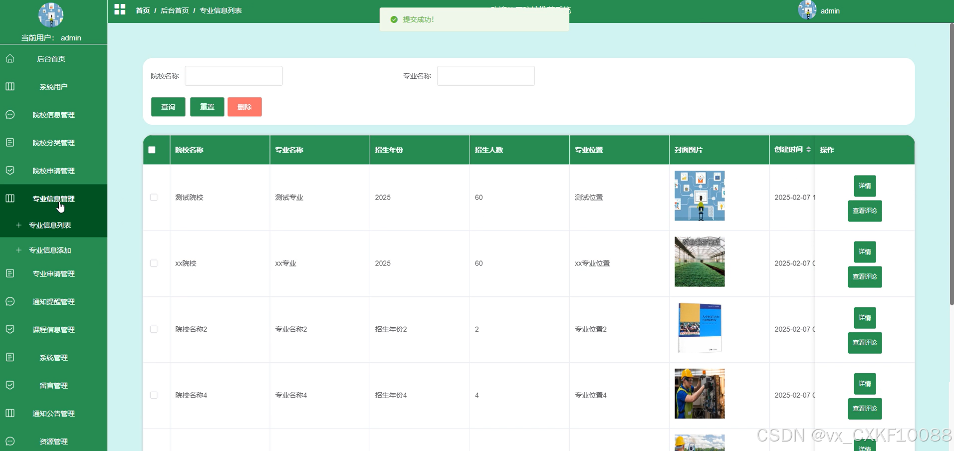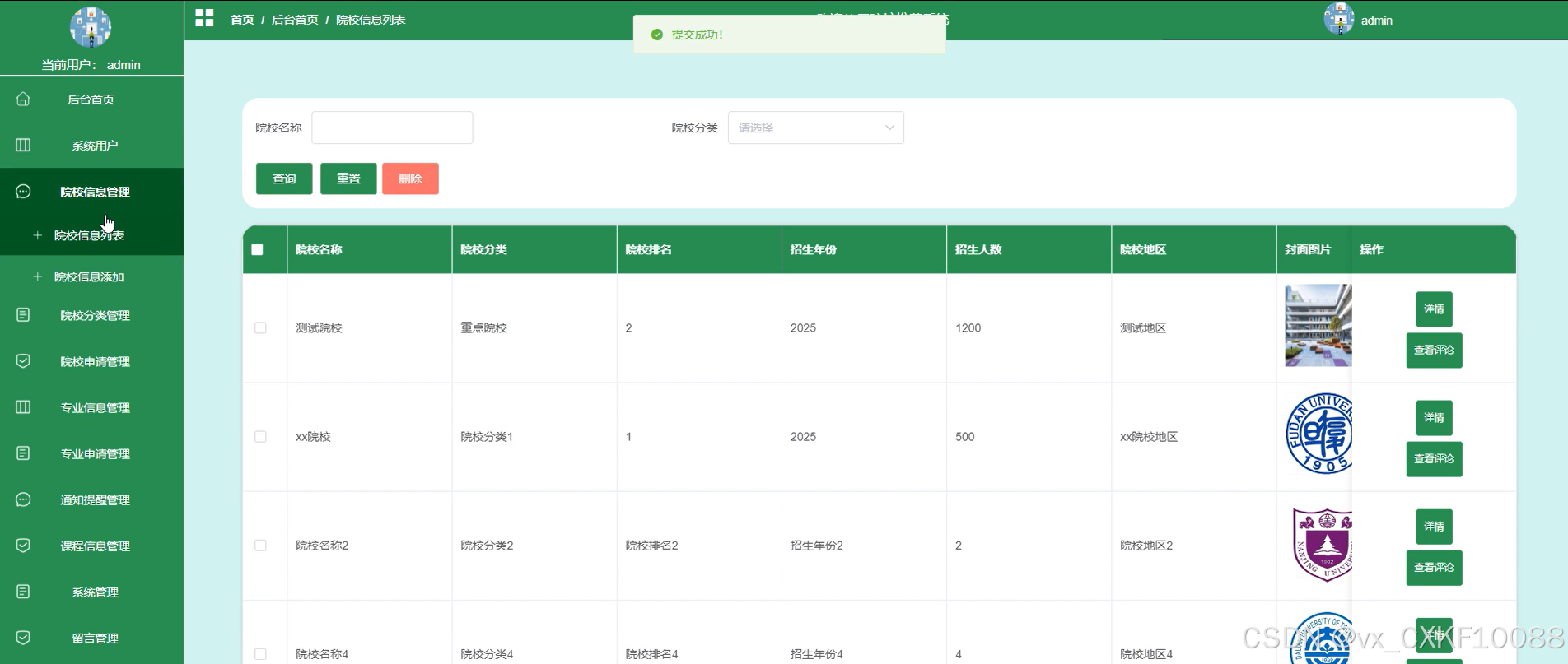(2)院校信息管理:院校信息列表与院校信息添加。院校信息列表可查看院校信息数据,并可查看每个院校详情与评论信息,并可进行查询、重置、删除、添加操作。