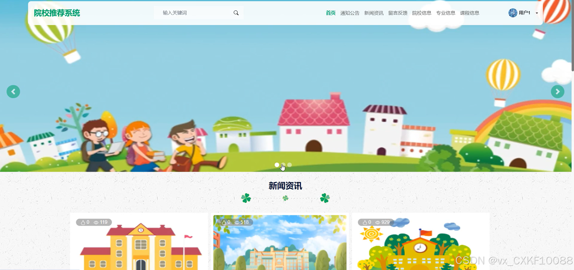 (1)首页:首页包含轮播图、新闻资讯,院校信息推荐。
