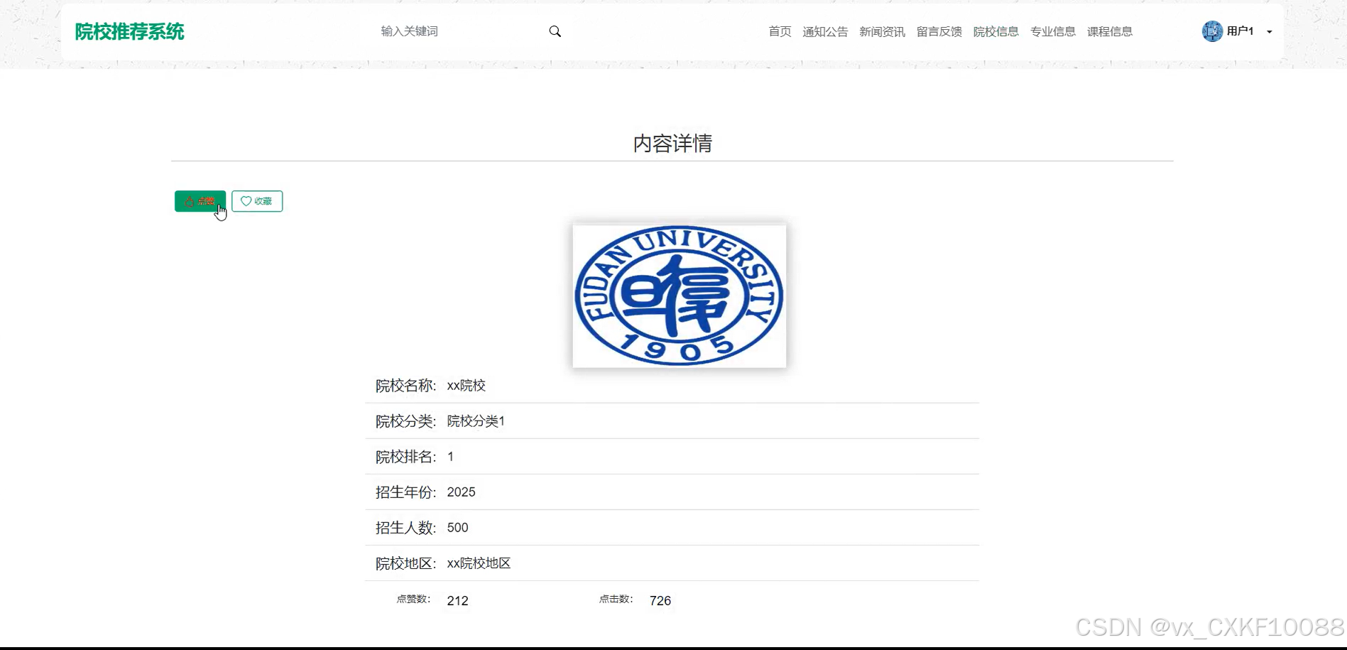 (4)院校信息:展示所有后台发布的院校信息列表信息,点击可查看院校详情信息。可进行院校申请、点赞、收藏以及发表评论。
