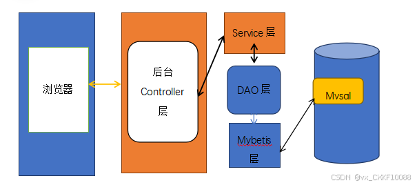 具体交互流程为:浏览器中执行具体操作,操作命令将生成一个do方法。该方法使得浏览器能够访问后台中的Controller层,Controller层由于业务上的需要执行进而访问Service层。Service层收到指令后将会去调用内部DAO层的接口。接口将会和MyBatis层下的一个SQL语句相对接。对接好之后进而访问MySql数据库。更新底层数据,然后将数据同步回MyBatis层,同步变化后的数据将通过DAO层接口,Service层和后台Controller层,直观反映到浏览器页面上。
