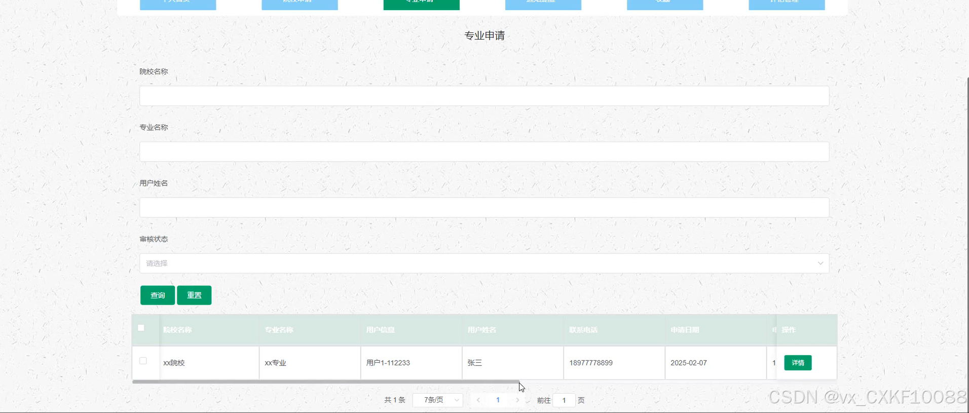 (6)专业申请管理::主要展示专业申请列表,可进行查询、重置查询、删除记录、查看详情,并处理专业申请等操作。