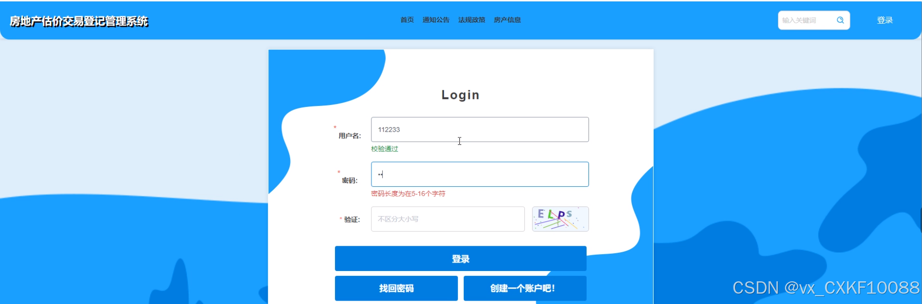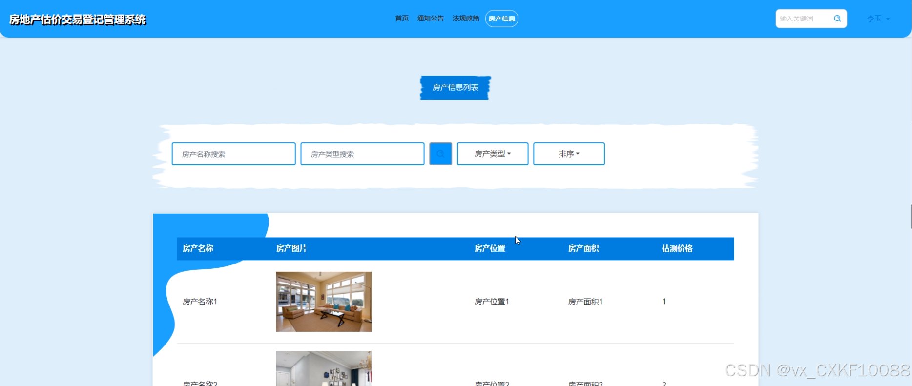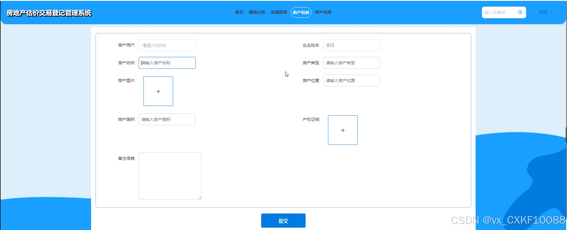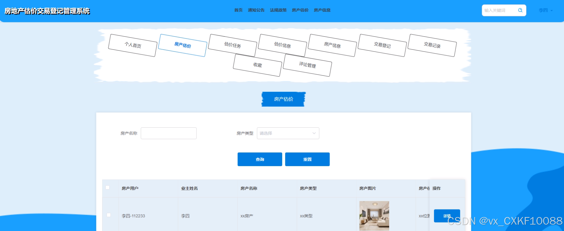 房产用户登录后,用户可以查看首页、通知公告、政策法规、房产信息并可以提交房产估价信息和管理个人中心信息。