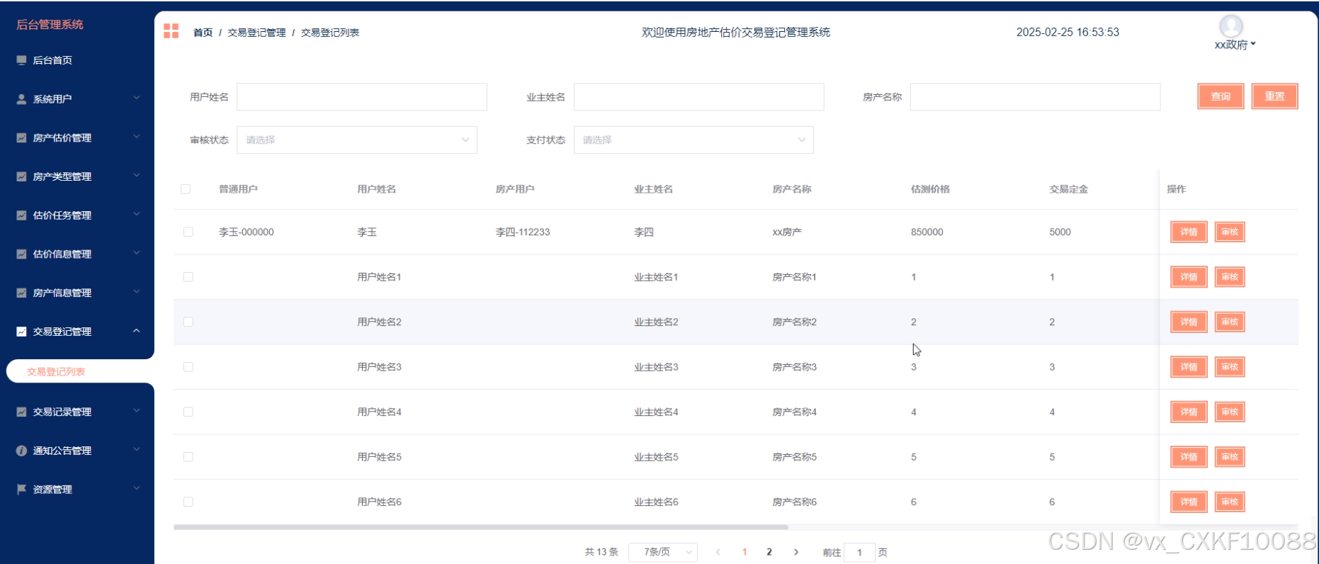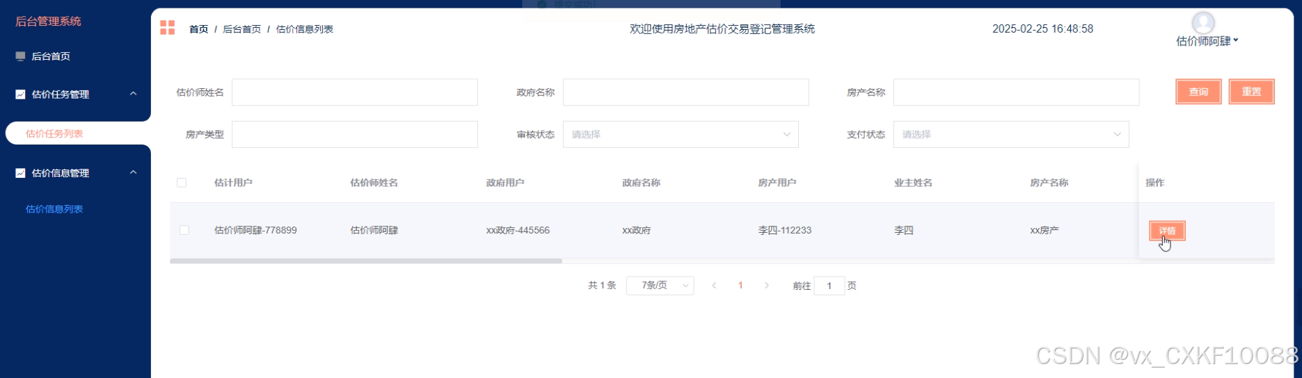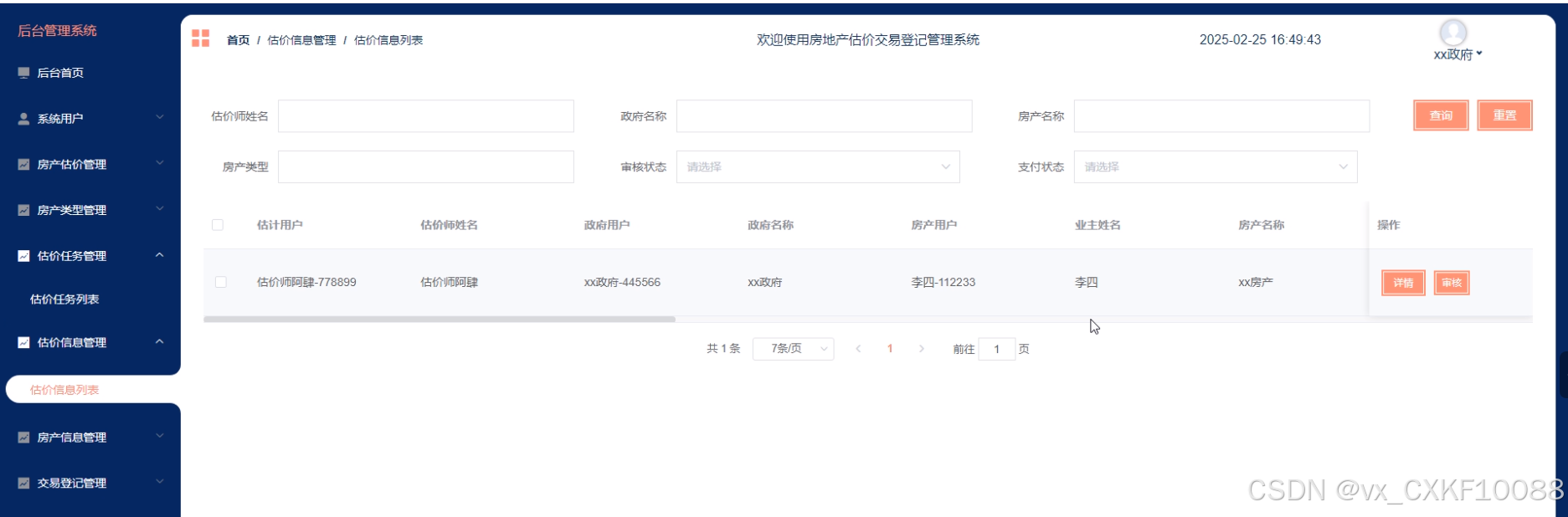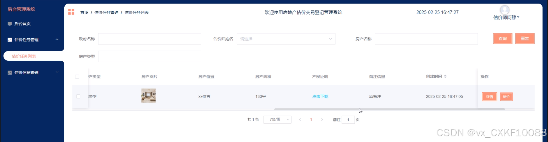 The system is mainly aimed at five types of users: real estate users, administrators, valuation users, government users, and vomiting users. After logging in, real estate users can view policies and regulations, property information, and submit property valuation information; Ordinary users can view policies and regulations, property information, and submit transaction registration information. Valuation users can view valuation tasks and submit valuation report information. For administrators and government users, they can comprehensively control various resources in the system, including but not limited to system users, property valuation, valuation task management, valuation information, property information, transaction registration, transaction records, etc., to ensure the authenticity and reliability of platform content, and to modify personal information and login passwords.