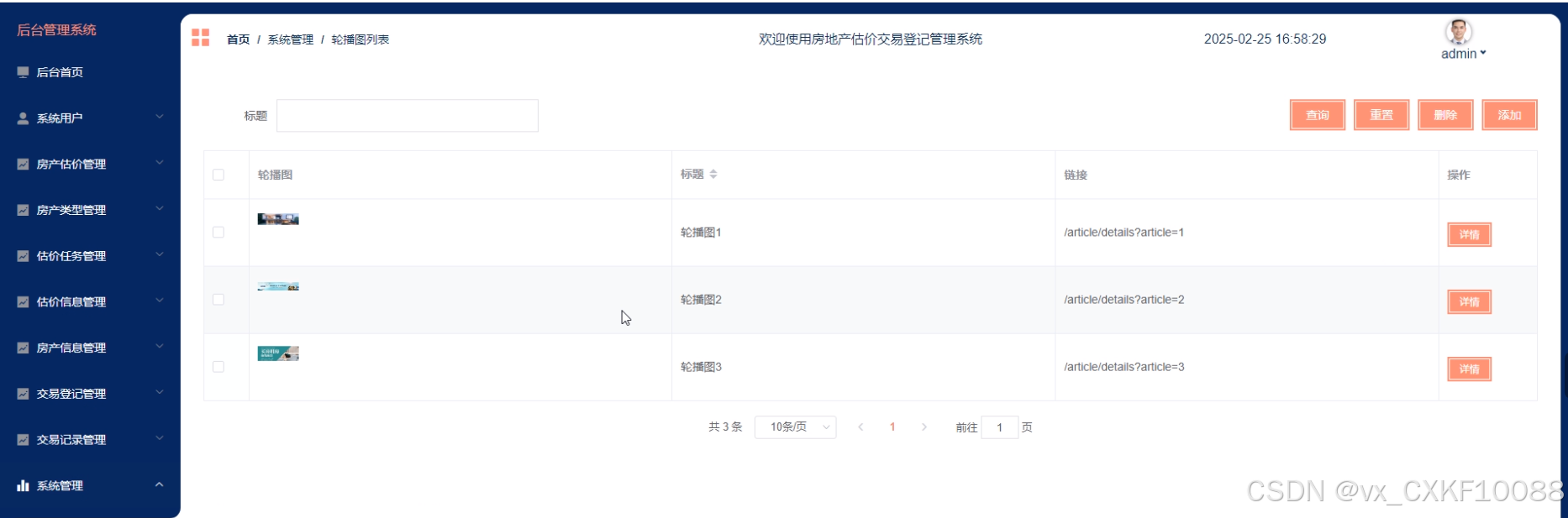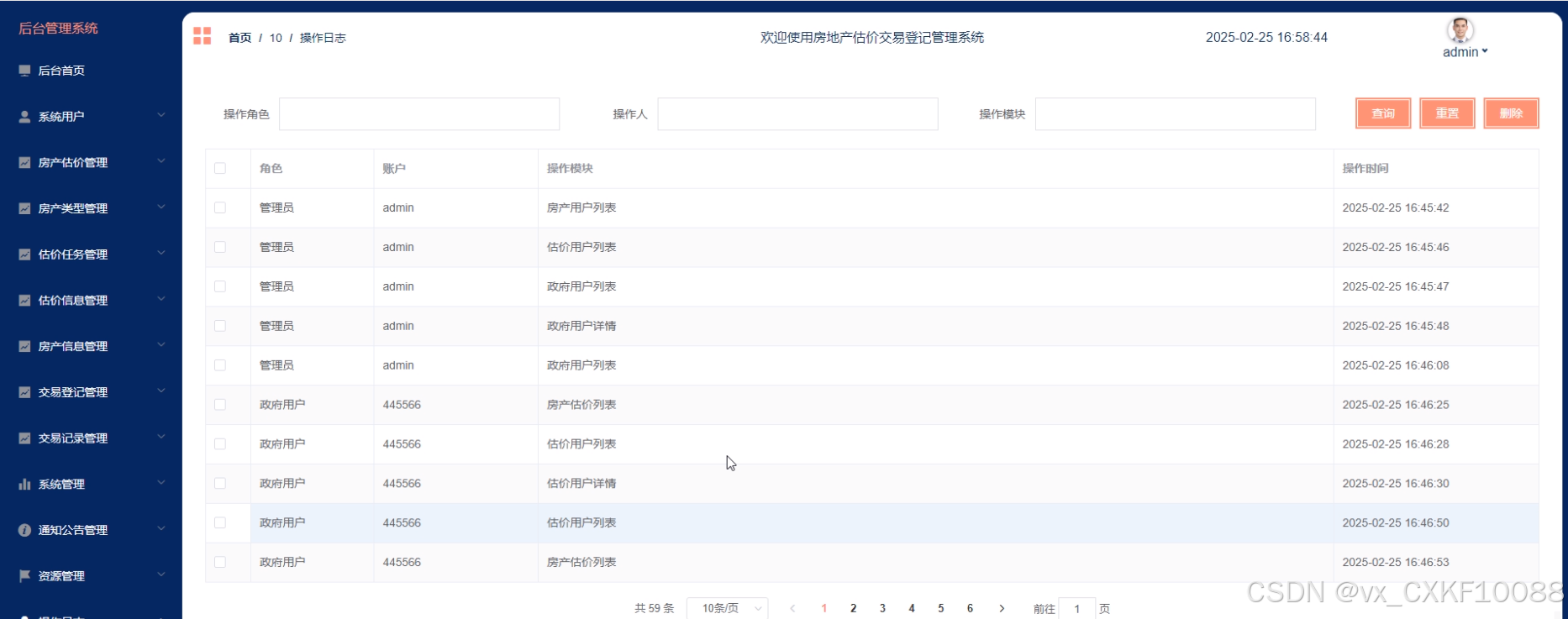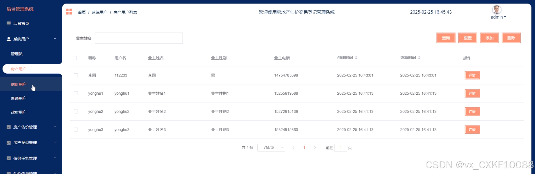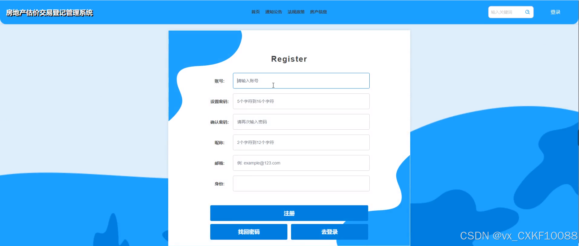 The system is mainly aimed at five types of users: real estate users, administrators, valuation users, government users, and vomiting users. After logging in, real estate users can view policies and regulations, property information, and submit property valuation information; Ordinary users can view policies and regulations, property information, and submit transaction registration information. Valuation users can view valuation tasks and submit valuation report information. For administrators and government users, they can comprehensively control various resources in the system, including but not limited to system users, property valuation, valuation task management, valuation information, property information, transaction registration, transaction records, etc., to ensure the authenticity and reliability of platform content, and to modify personal information and login passwords.