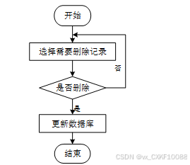 用户选择需要删除的记录后,系统判断是否确认删除。若未确认,返回选择环节;若确认删除,则更新数据库,删除对应记录,完成操作后流程结束。删除信息流程图如图3-9所示。