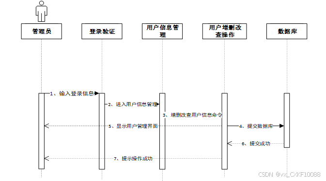 管理员输入登录信息后,进入用户信息管理模块,选择增删改查操作并提交命令至数据库。数据库执行操作后返回成功状态,系统显示用户管理界面并提示操作成功。管理员修改用户信息时序图如图4-5所示。