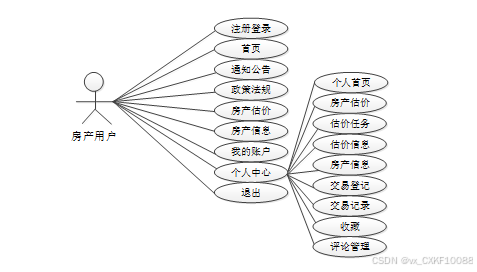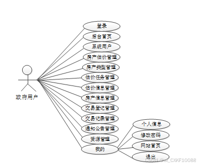 该系统主要面向五类用户:房产用户、管理员、估价用户、政府用户以及呕吐用户。房产用户登录后可以进行查看政策法规、房产信息,并提交房产估价信息等操作;普通用户则可查看政策法规、房产信息并提交交易登记信息等操作。估价用户能够查看估价任务并提交估价报告信息。对于管理员和政府用户而言,他们可以对系统中的各类资源进行全面管控,包括但不限于系统用户、房产估价、估价任务管理、估价信息、房产信息、交易登记、交易记录等,确保平台内容的真实性和可靠性,并进行个人信息及登录密码的修改操作。