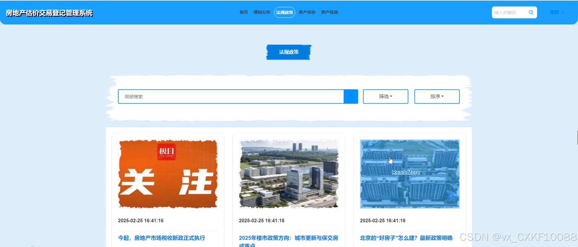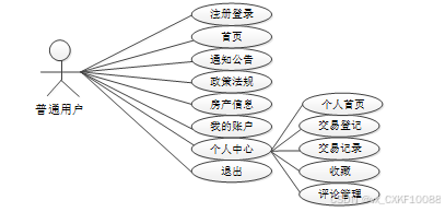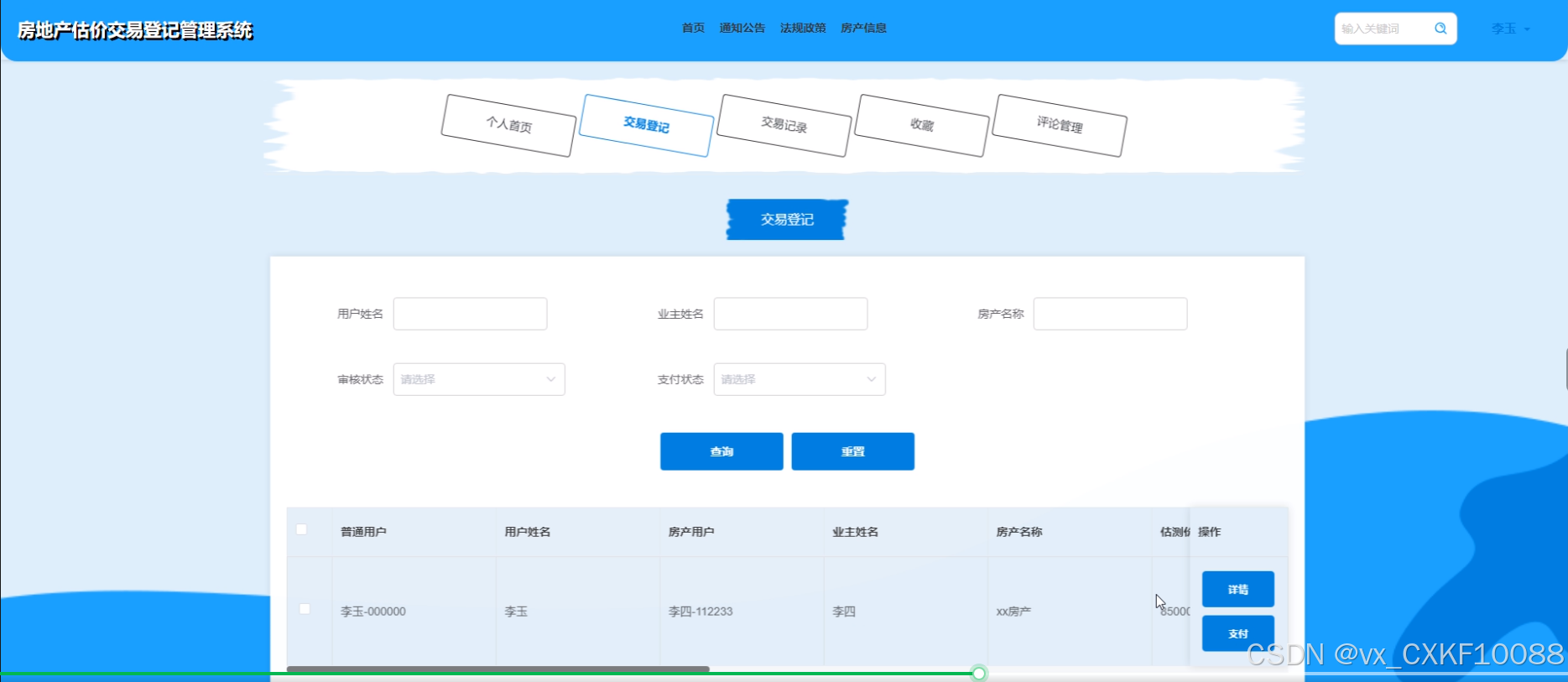 普通用户登录后,用户可以查看首页、通知公告、政策法规、房产信息并可以提交交易登记信息和管理个人中心信息。
