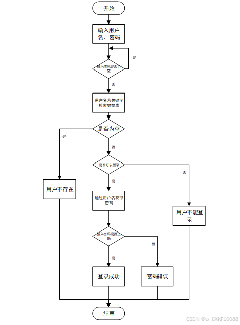 用户输入用户名和密码后,系统先检查输入是否为空,再验证用户名是否存在,若存在则通过用户名获取密码并校验。若密码正确则登录成功,否则提示密码错误。若用户名不存在或无法登录,提示用户操作无效。如图3-5所示。