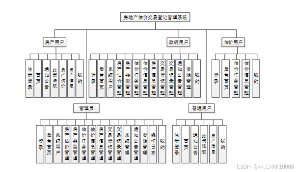 功能模块设计是系统开发过程中的重要阶段,它旨在将系统划分为不同的模块,每个模块负责完成特定的功能或任务。基于微服务的房地产估价交易登记管理系统由房产用户、销售用户和管理员这三大用户功能模块组成,每个用户模块又包含具体的功能操作。系统整体功能结构图如下图4.2所示。
