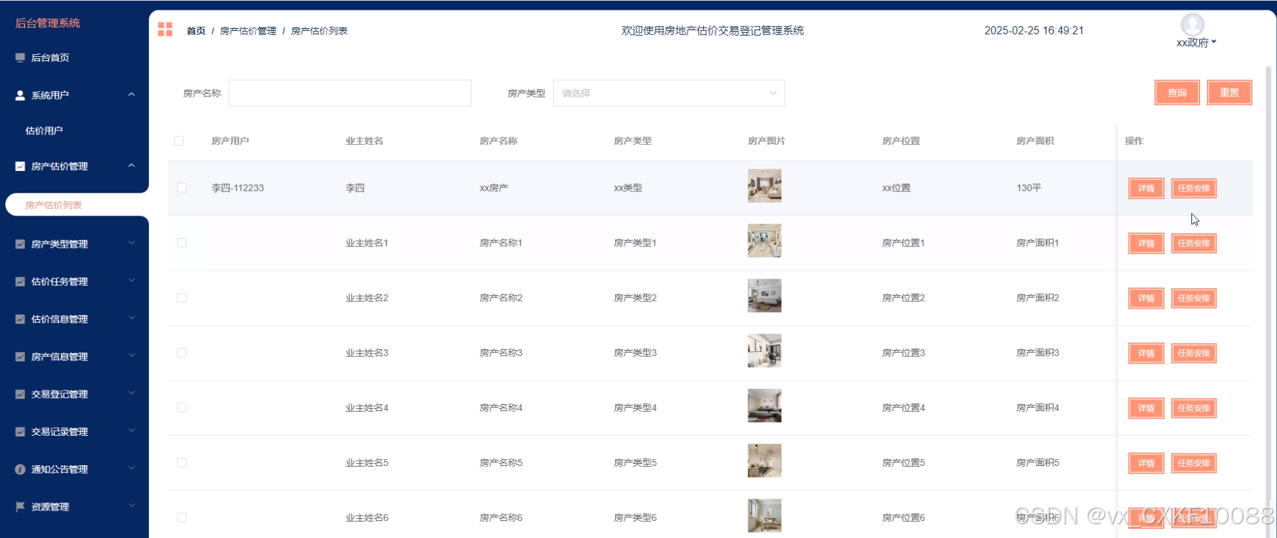 政府用户登录后,可以对房产估价、估价任务管理、估价信息、房产信息、交易登记、交易记录等进行全面的管控并可以进行修改个人信息和登录密码等操作。